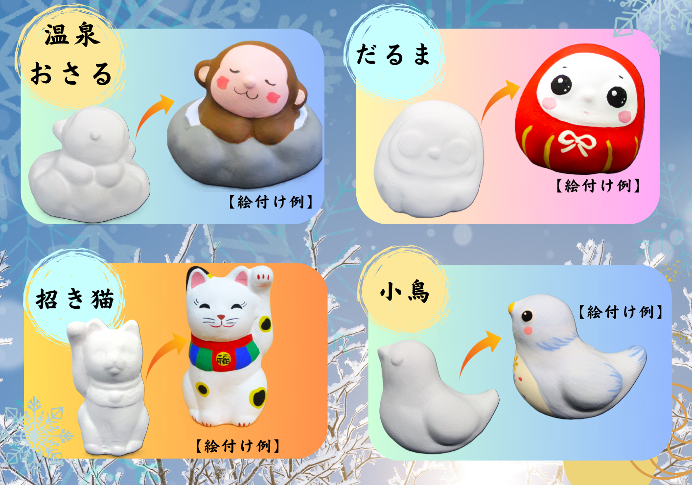 絵付け体験ができる作品は全4種類(温泉おさる・だるま・招き猫・ことり)